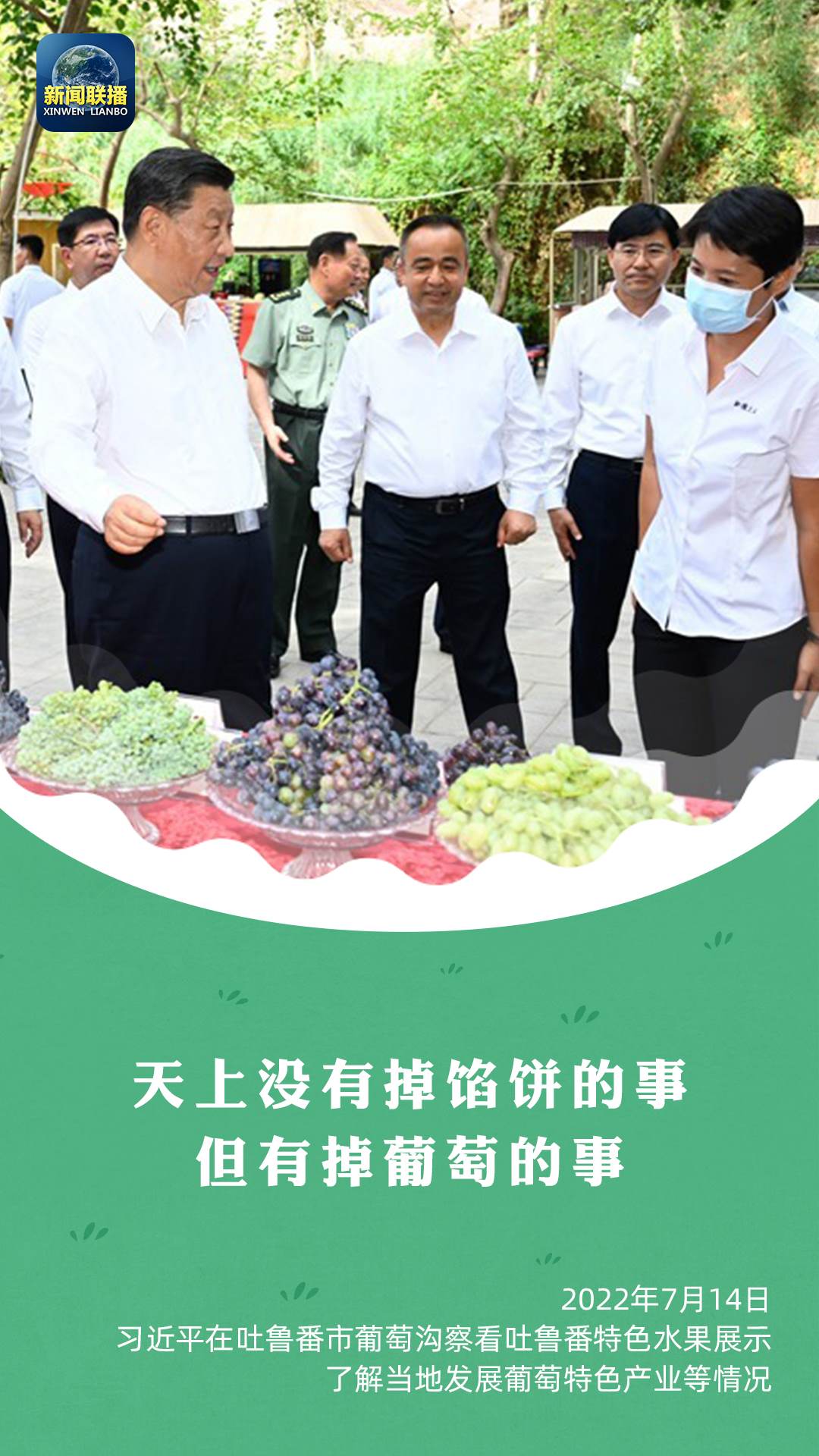 “多么富饒的一個(gè)地方,瓜果飄香。這是大自然的饋贈(zèng)?!笨倳涳L(fēng)趣地說,“天上沒有掉餡餅的事,但有掉葡萄的事?!笨倳涍€強(qiáng)調(diào),要推動(dòng)文化和旅游融合發(fā)展,打造富民產(chǎn)業(yè)。