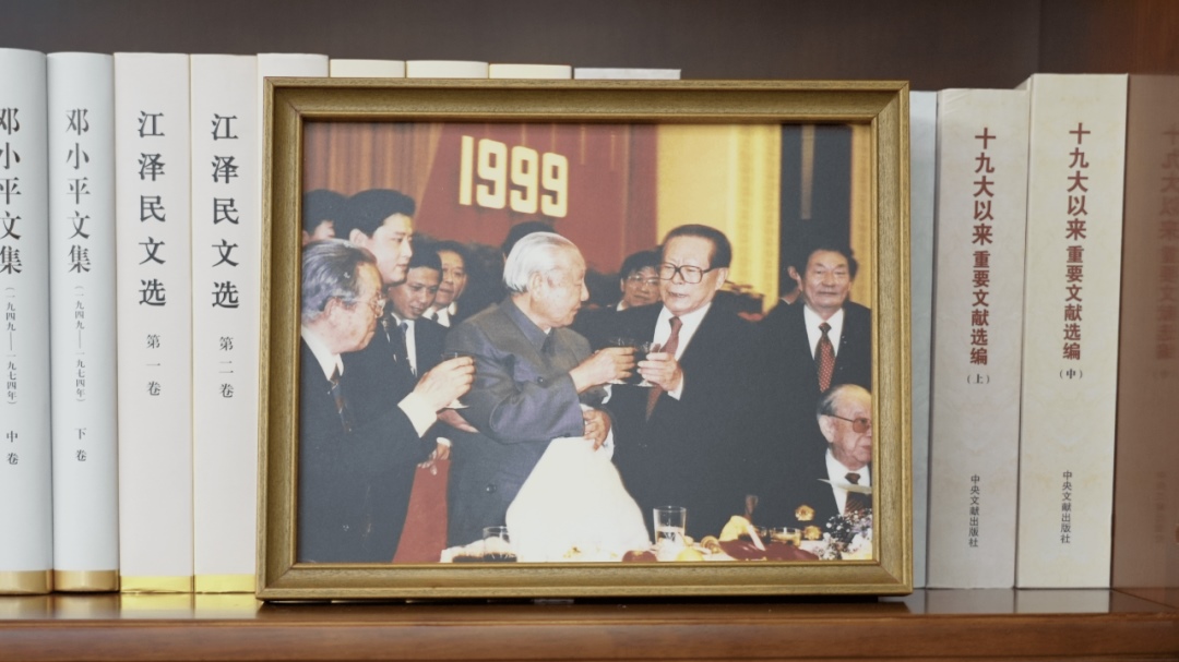 書(shū)架上擺放著一張合影。這是1999年9月30日,江澤民同志、朱镕基同志、習(xí)仲勛同志在慶祝建國(guó)五十周年招待會(huì)上。這張照片第一次出現(xiàn)在習(xí)近平總書(shū)記的書(shū)架上。