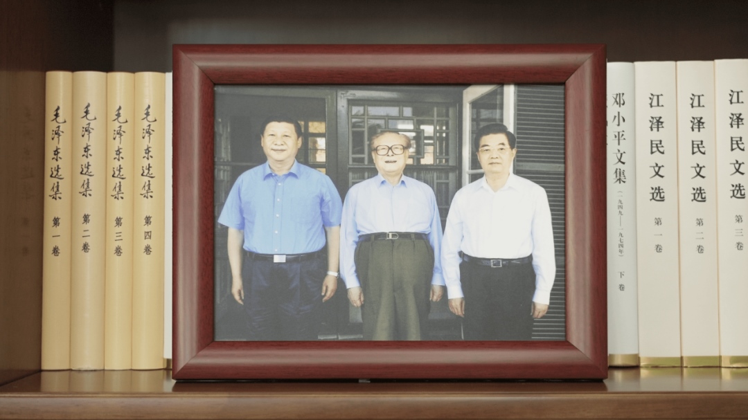 書(shū)架上還有一張習(xí)近平總書(shū)記同江澤民同志、胡錦濤同志的合影。這張照片第一次出現(xiàn)在習(xí)近平總書(shū)記的書(shū)架上。