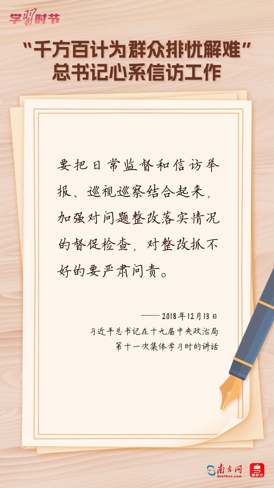 2022年5月1日,中共中央、國(guó)務(wù)院印發(fā)的《信訪工作條例》正式實(shí)施?!缎旁L工作條例》以習(xí)近平新時(shí)代中國(guó)特色社會(huì)主義思想為指導(dǎo),深入貫徹習(xí)近平總書記關(guān)于加強(qiáng)和改進(jìn)人民信訪工作的重要思想,總結(jié)黨長(zhǎng)期以來(lái)領(lǐng)導(dǎo)和開(kāi)展信訪工作經(jīng)驗(yàn)特別是黨的十八大以來(lái)信訪工作制度改革成果,堅(jiān)持和加強(qiáng)黨對(duì)信訪工作的全面領(lǐng)導(dǎo),理順信訪工作體制機(jī)制,是新時(shí)代信訪工作的基本遵循。今年5月1日是《信訪工作條例》實(shí)施一周年,“學(xué)習(xí)時(shí)節(jié)”整理摘錄習(xí)近平總書記關(guān)于信訪工作的重要講話和重要指示批示,與您一同學(xué)習(xí)。