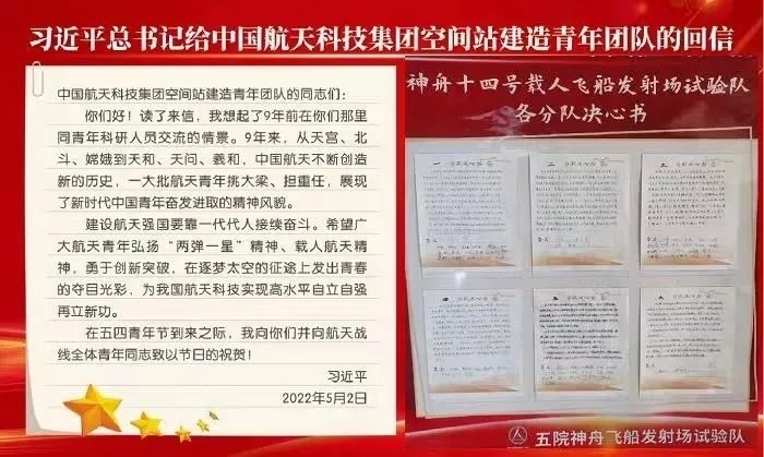 2022年5月2日,習近平總書記給中國航天科技集團空間站建造青年團隊回信,高度肯定航天青年,殷切期待青春奮斗。他強調(diào):“希望廣大航天青年弘揚‘兩彈一星’精神、載人航天精神,勇于創(chuàng)新突破,在逐夢太空的征途上發(fā)出青春的奪目光彩,為我國航天科技實現(xiàn)高水平自立自強再立新功?!币荒陙?,五院人持續(xù)學習重溫、堅決貫徹落實習近平總書記重要回信精神和關(guān)于航天強國建設(shè)的重要指示批示精神,始終做到牢記囑托、感恩奮進,交出非凡“答卷”。