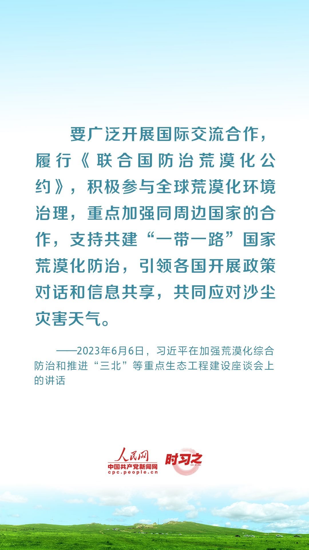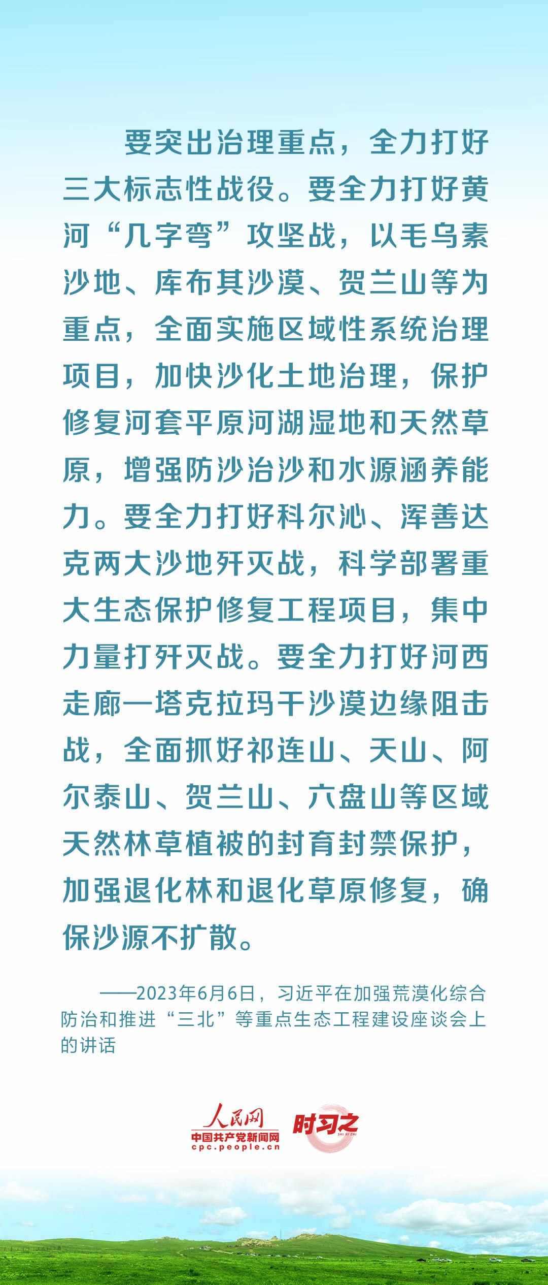2023年6月5日至6日,中共中央總書記、國(guó)家主席、中央軍委主席習(xí)近平在內(nèi)蒙古自治區(qū)巴彥淖爾市考察,主持召開加強(qiáng)荒漠化綜合防治和推進(jìn)“三北”等重點(diǎn)生態(tài)工程建設(shè)座談會(huì)并發(fā)表重要講話。座談會(huì)上,習(xí)近平對(duì)走好中國(guó)特色防沙治沙道路提出工作要求。