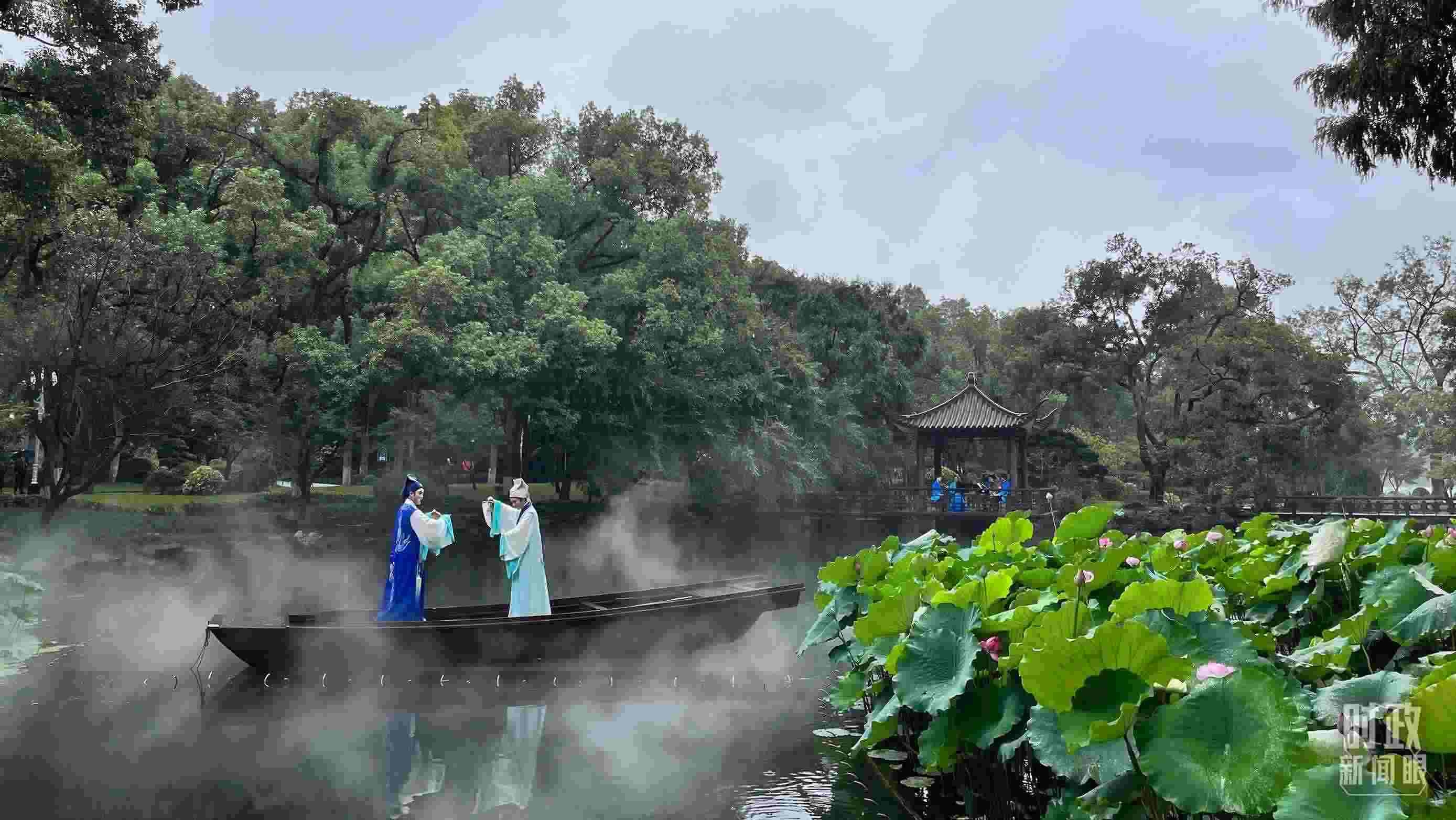 沿著湖畔長(zhǎng)廊,漫步至漪園宴會(huì)廳,沿途可以欣賞浙江小百花越劇院青年演員表演的越劇經(jīng)典劇目《梁?!愤x段《十八相送》。