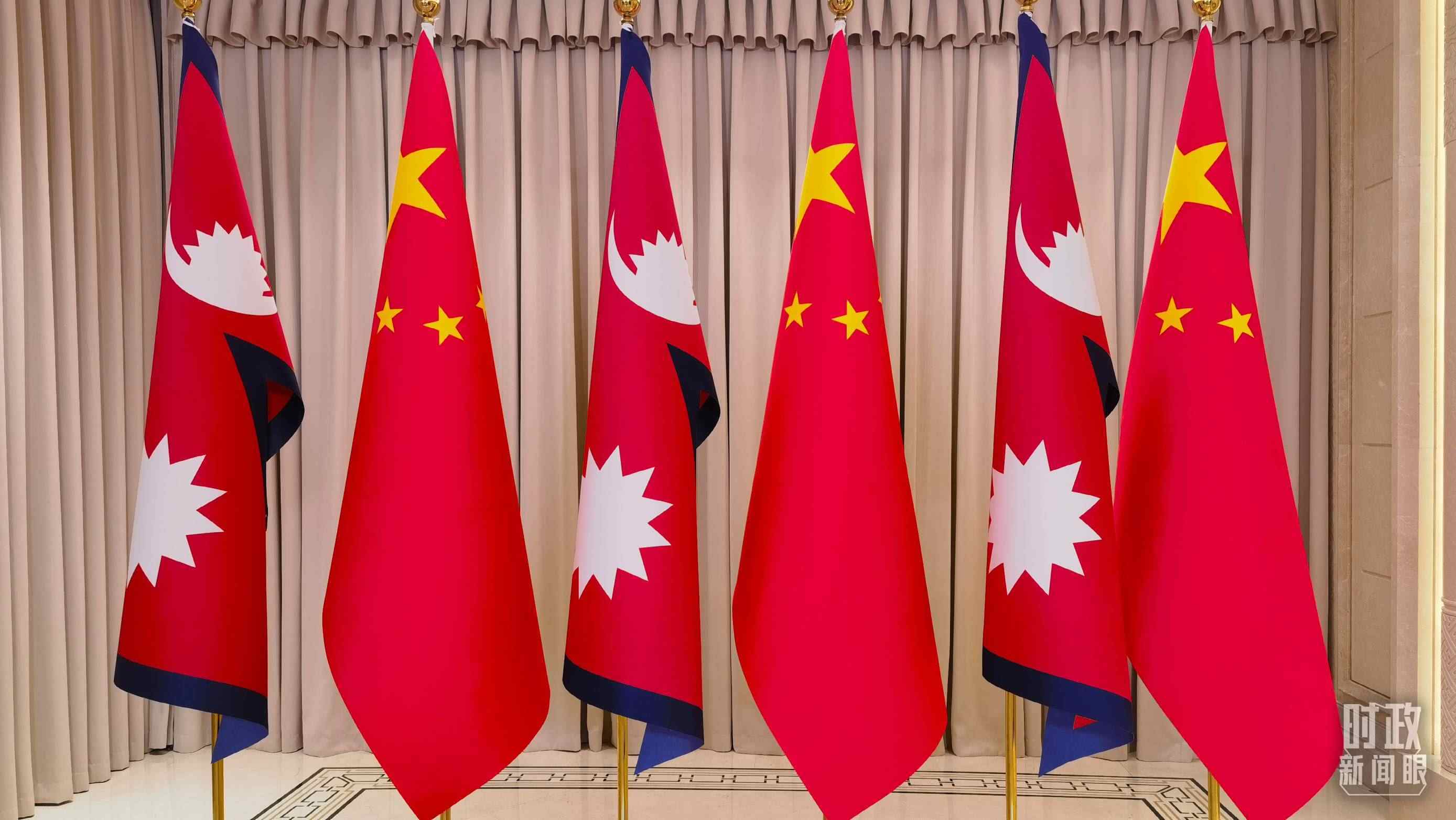 △會(huì)見(jiàn)現(xiàn)場(chǎng)擺放的中國(guó)、尼泊爾國(guó)旗。(總臺(tái)央視記者周志國(guó)拍攝)
