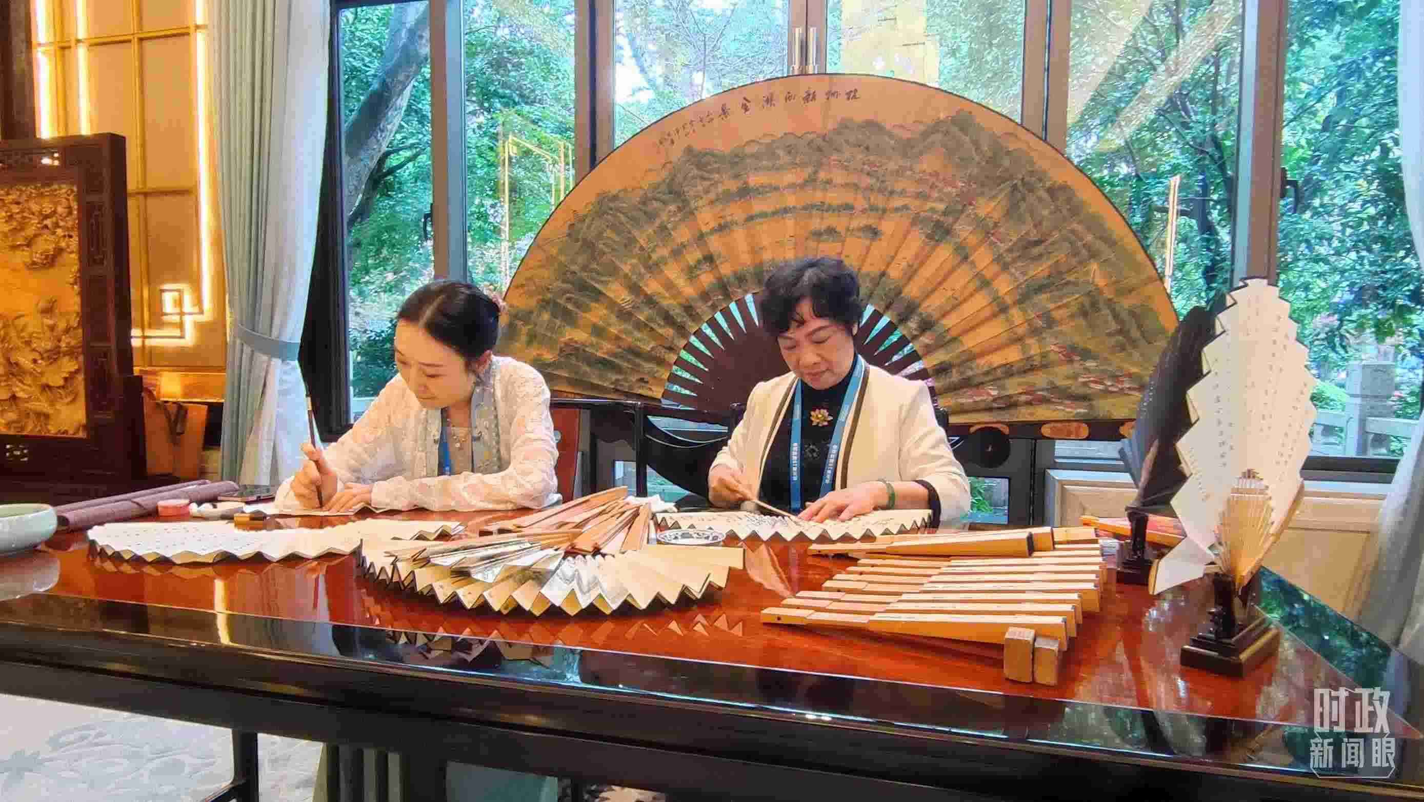 宴會(huì)廳外,東陽(yáng)木雕、杭州刺繡、王星記扇等浙江非物質(zhì)文化遺產(chǎn)展示,吸引貴賓們流連駐足。