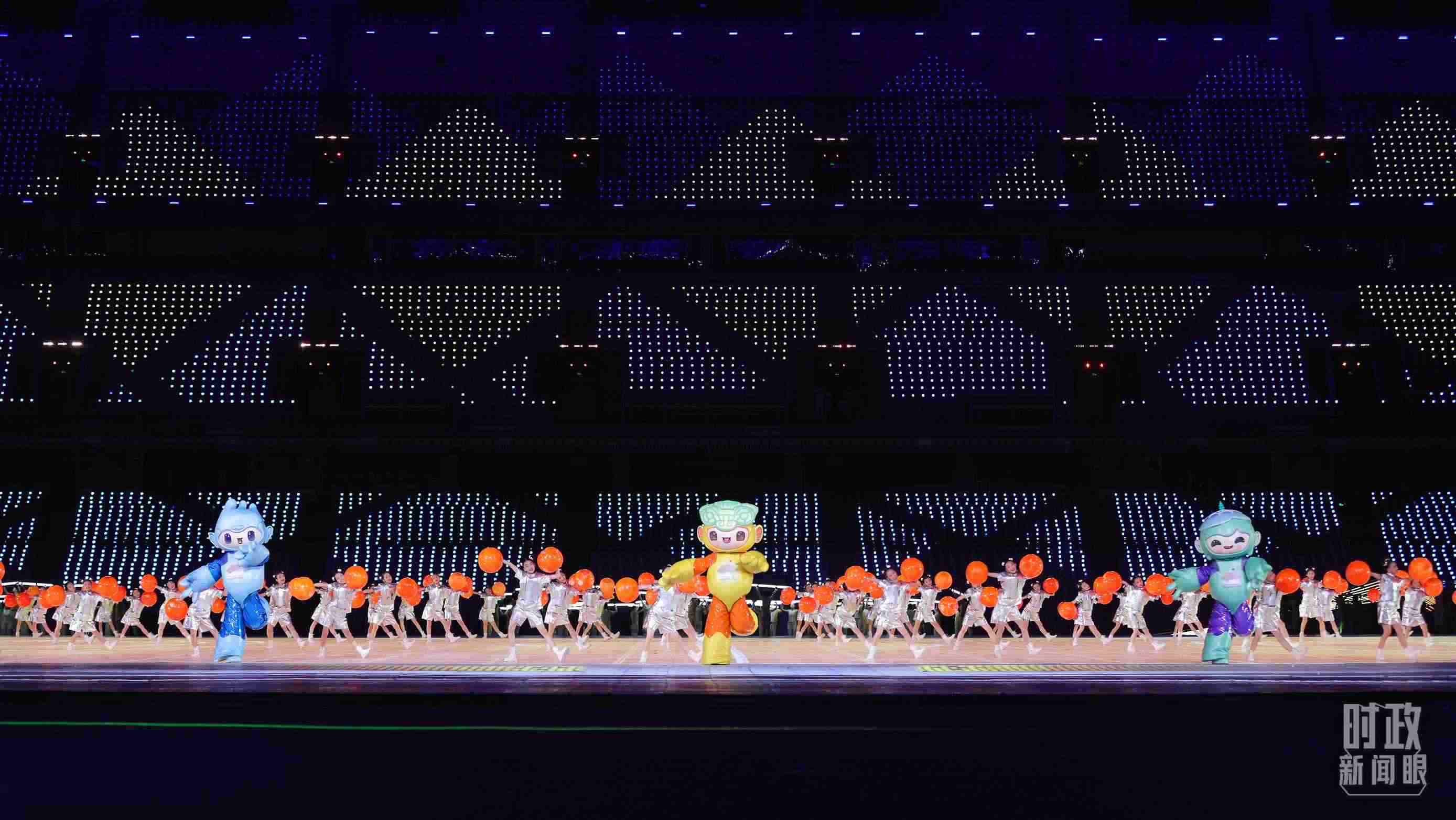 △開(kāi)幕式文藝表演中的亞運(yùn)會(huì)吉祥物。(總臺(tái)央視記者魏幫軍拍攝)