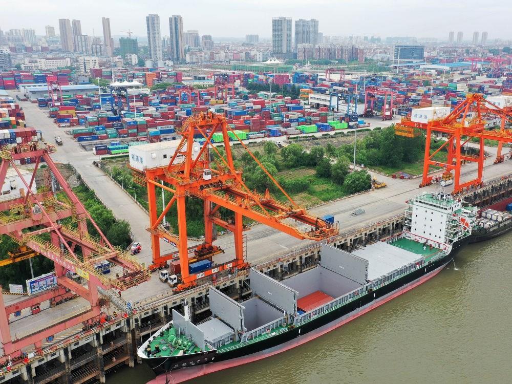 “華航漢亞2號(hào)”貨輪停靠在武漢新港陽(yáng)邏集裝箱碼頭進(jìn)行裝箱作業(yè)(2020年5月9日攝,無(wú)人機(jī)照片)。新華社發(fā)(趙軍 攝)