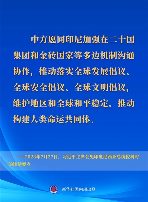 7月27日下午,國(guó)家主席習(xí)近平在成都會(huì)見來華出席第31屆世界大學(xué)生夏季運(yùn)動(dòng)會(huì)開幕式并訪華的印度尼西亞總統(tǒng)佐科。一起來看習(xí)近平主席在會(huì)見時(shí)的談話要點(diǎn)↓