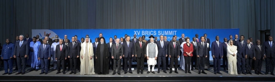 會議由南非總統(tǒng)拉馬福薩主持,巴西總統(tǒng)盧拉、印度總理莫迪、俄羅斯總統(tǒng)普京(線上)和60多位非洲國家及其他新興市場和發(fā)展中國家領(lǐng)導(dǎo)人或代表,以及聯(lián)合國秘書長古特雷斯、新開發(fā)銀行行長羅塞夫等國際和地區(qū)組織負責(zé)人出席。這是與會領(lǐng)導(dǎo)人集體合影。新華社記者 李學(xué)仁 攝