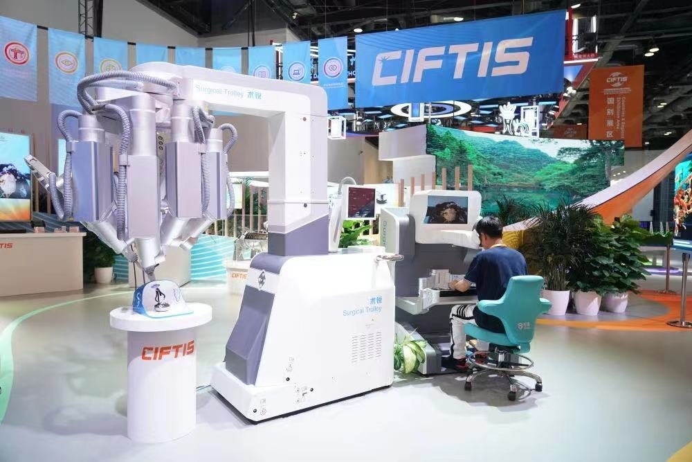 △2023年服貿(mào)會國家會議中心綜合展區(qū)展出的單孔腔鏡手術機器人