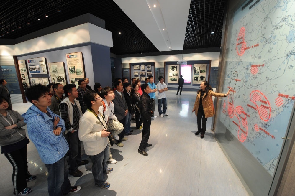?↑ 在鹽城新四軍紀念館內(nèi),講解員在向觀眾介紹南方紅軍游擊隊整編為新四軍示意圖(2011年5月26日攝)。