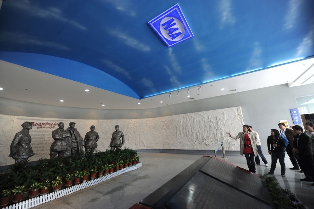 ?↑ 在鹽城新四軍紀念館,講解員在向觀眾介紹展廳入口處的浮雕和塑像(2011年5月27日攝)。