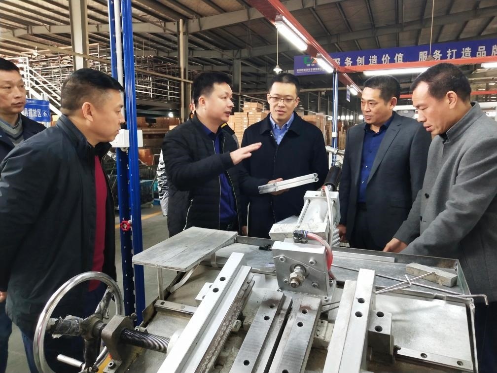 熊樹(shù)生(左三)在龍泉市一家企業(yè)車(chē)間內(nèi)介紹汽車(chē)空調(diào)冷凝器。受訪者供圖