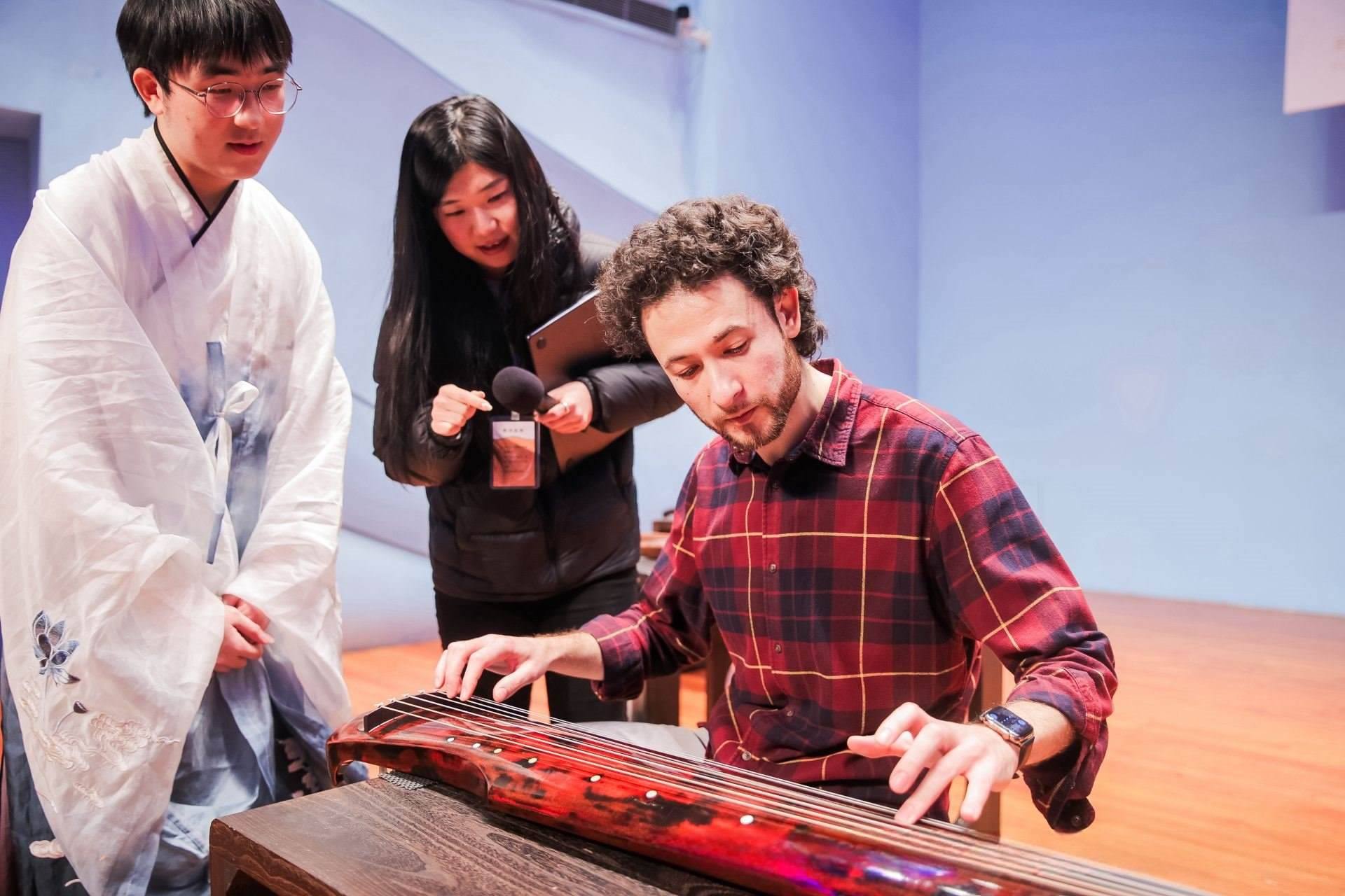 (▲俄羅斯圣彼得堡交響樂團(tuán)指揮迪米特里斯·博蒂尼斯體驗(yàn)中國(guó)古琴)