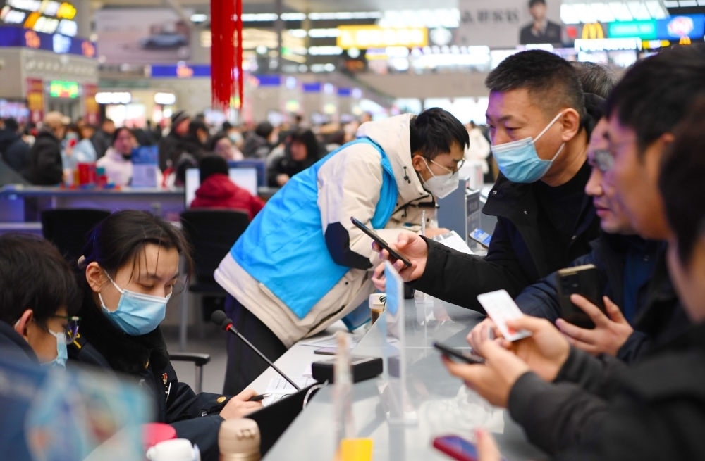 在鄭州東站候車(chē)大廳“心馨”黨員服務(wù)臺(tái),旅客在咨詢(xún)乘車(chē)事宜(2024年2月1日攝)。新華社記者 郝源 攝