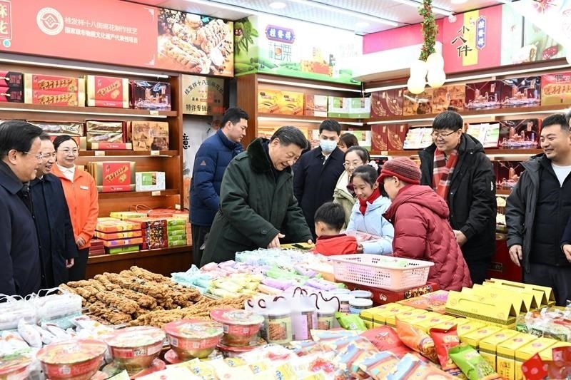 歷史悠久的桂發(fā)祥十八街麻花、果仁張的店鋪里,顧客絡(luò)繹不絕。2月1日,習(xí)近平總書記走進(jìn)店里,問品種、問客流、問價格,還掏錢買了幾盒麻花和栗子羹,送了兩盒給身旁的一名小男孩。