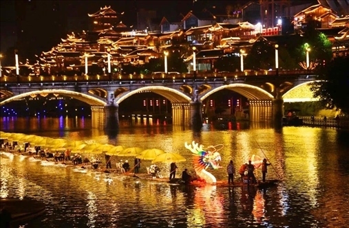 同樣迎來2024年龍年新春燈會(huì)的,還有湖北省恩施州宣恩縣城,這里的龍?jiān)煨蜔艚M格外亮眼,特別是其中一條非常壯觀的“貢水游龍”,龍身由30多只竹筏串聯(lián)而成,總長(zhǎng)度達(dá)到200多米。游客還可以登上龍船觀燈展、賞夜色。隨著金色的巨龍?jiān)诒趟序暄延蝿?dòng),也傳遞著吉祥的寓意。