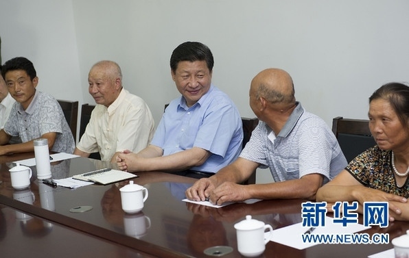 ▲2013年7月21日至23日,中共中央總書記、國家主席、中央軍委主席習(xí)近平在湖北調(diào)研全面深化改革問題和當(dāng)前經(jīng)濟(jì)運行情況。 22日下午,習(xí)近平來到鄂州市長港鎮(zhèn)峒山村,了解城鄉(xiāng)一體化建設(shè)情況,同部分村民座談。