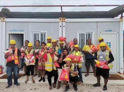 △中國企業(yè)為瑙魯當?shù)貑T工發(fā)放節(jié)日慰問品。
