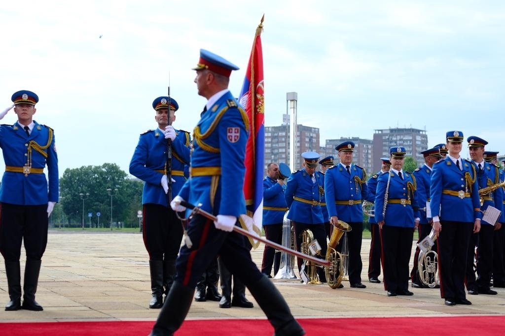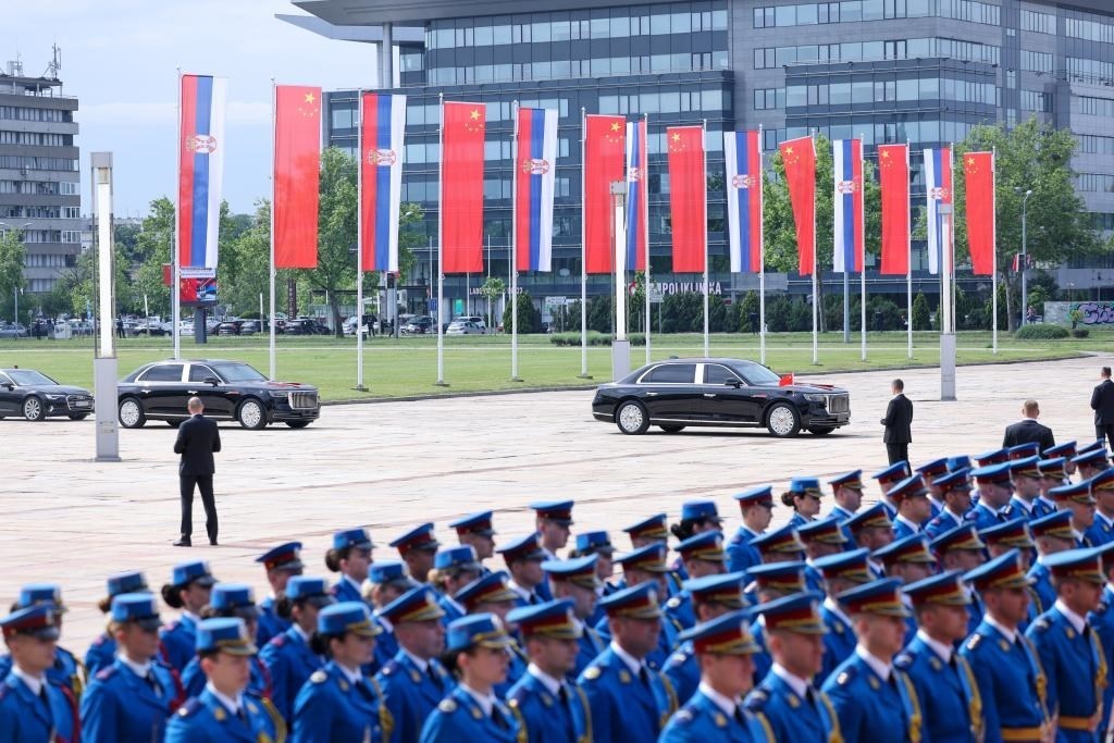 當(dāng)?shù)貢r(shí)間5月8日,國家主席習(xí)近平在貝爾格萊德出席塞爾維亞總統(tǒng)武契奇舉行的隆重盛大歡迎儀式。歡迎儀式在塞爾維亞大廈南廣場舉行。兩國元首共同登上檢閱臺(tái),軍樂團(tuán)奏響中塞兩國國歌,鳴10響禮炮。習(xí)近平在武契奇陪同下檢閱儀仗隊(duì)。