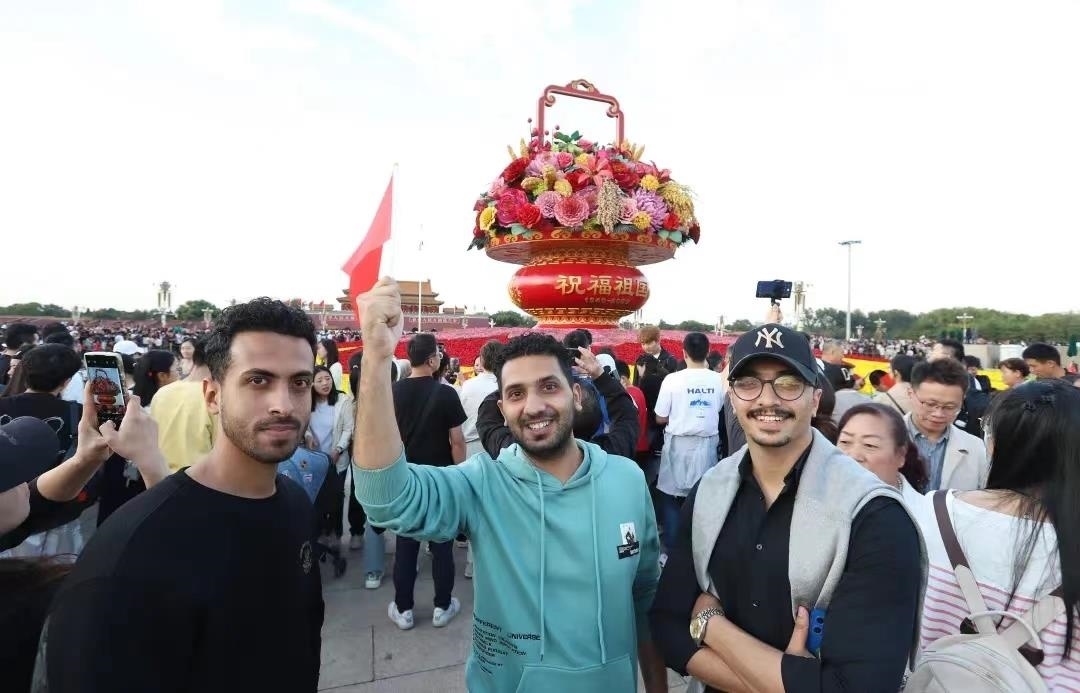 △2023年10月1日,三位來自阿爾及利亞的游客在北京天安門廣場(chǎng)“祝福祖國”巨型花籃前留影。