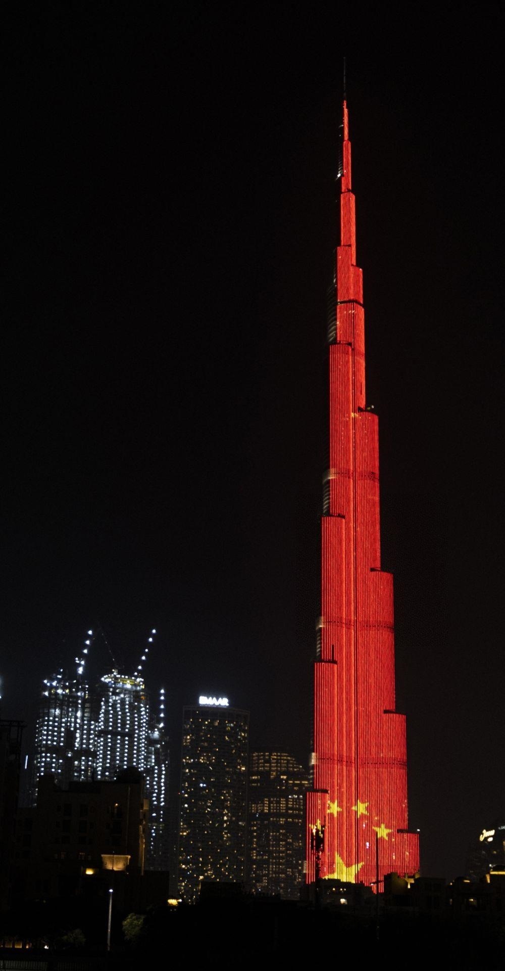 △當(dāng)?shù)貢r(shí)間2020年2月2日,在阿聯(lián)酋迪拜,當(dāng)?shù)氐貥?biāo)建筑物哈利法塔點(diǎn)亮中國國旗圖案,為中國抗擊新冠肺炎疫情加油。