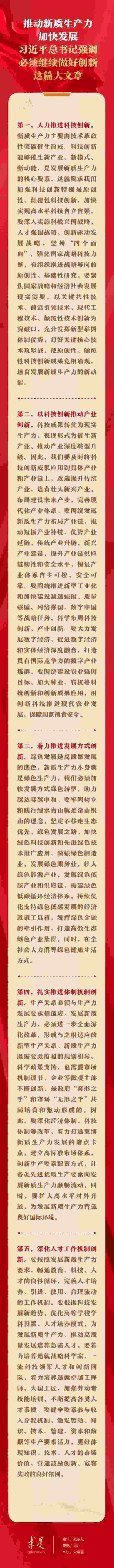 6月1日出版的第11期《求是》雜志刊發(fā)習(xí)近平總書(shū)記重要文章《發(fā)展新質(zhì)生產(chǎn)力是推動(dòng)高質(zhì)量發(fā)展的內(nèi)在要求和重要著力點(diǎn)》。在這篇重要文章中,習(xí)近平總書(shū)記從科技創(chuàng)新、產(chǎn)業(yè)創(chuàng)新、發(fā)展方式創(chuàng)新、體制機(jī)制創(chuàng)新、人才工作機(jī)制創(chuàng)新等五個(gè)方面,對(duì)推動(dòng)新質(zhì)生產(chǎn)力加快發(fā)展提出明確要求。