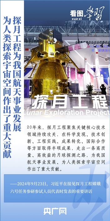 中國(guó)探月工程成果凝結(jié)著我國(guó)幾代航天人的智慧和心血。9月23日,習(xí)近平總書記接見探月工程嫦娥六號(hào)任務(wù)參研參試人員代表并發(fā)表重要講話??倳浉叨瓤隙ㄦ隙鹆?hào)任務(wù)成功的重要意義,以及探月工程為我國(guó)航天事業(yè)發(fā)展、為人類探索宇宙空間作出的重大貢獻(xiàn),勉勵(lì)航天戰(zhàn)線工作者再接再厲、乘勢(shì)而上,為建設(shè)航天強(qiáng)國(guó)再立新功。一起來學(xué)習(xí)!
