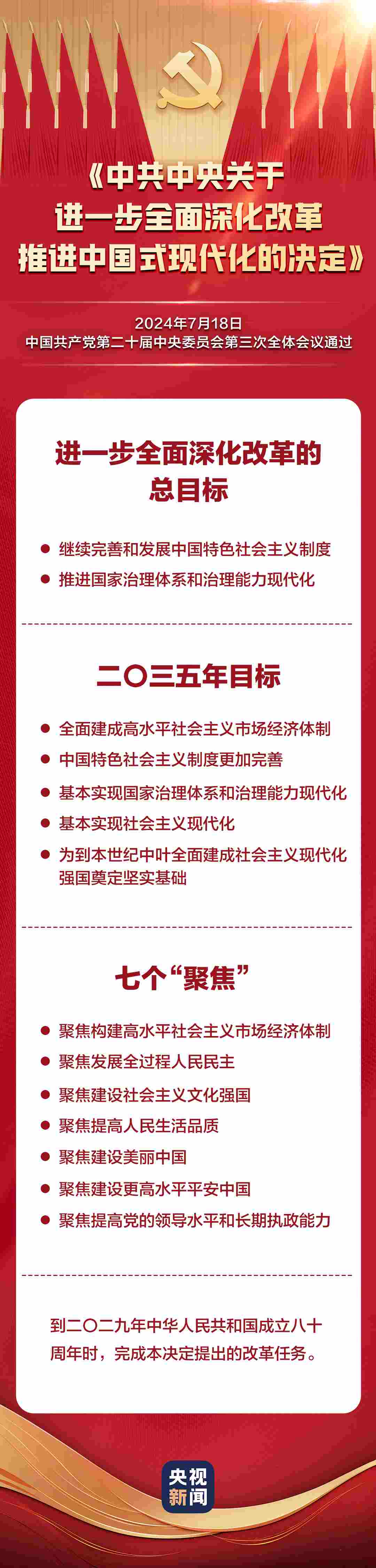 中國共產(chǎn)黨第二十屆中央委員會第三次全體會議,于2024年7月15日至18日在北京舉行。全會最重要的成果是審議通過《中共中央關于進一步全面深化改革、推進中國式現(xiàn)代化的決定》。《決定》共15部分、60條,分三大板塊,一文速覽: