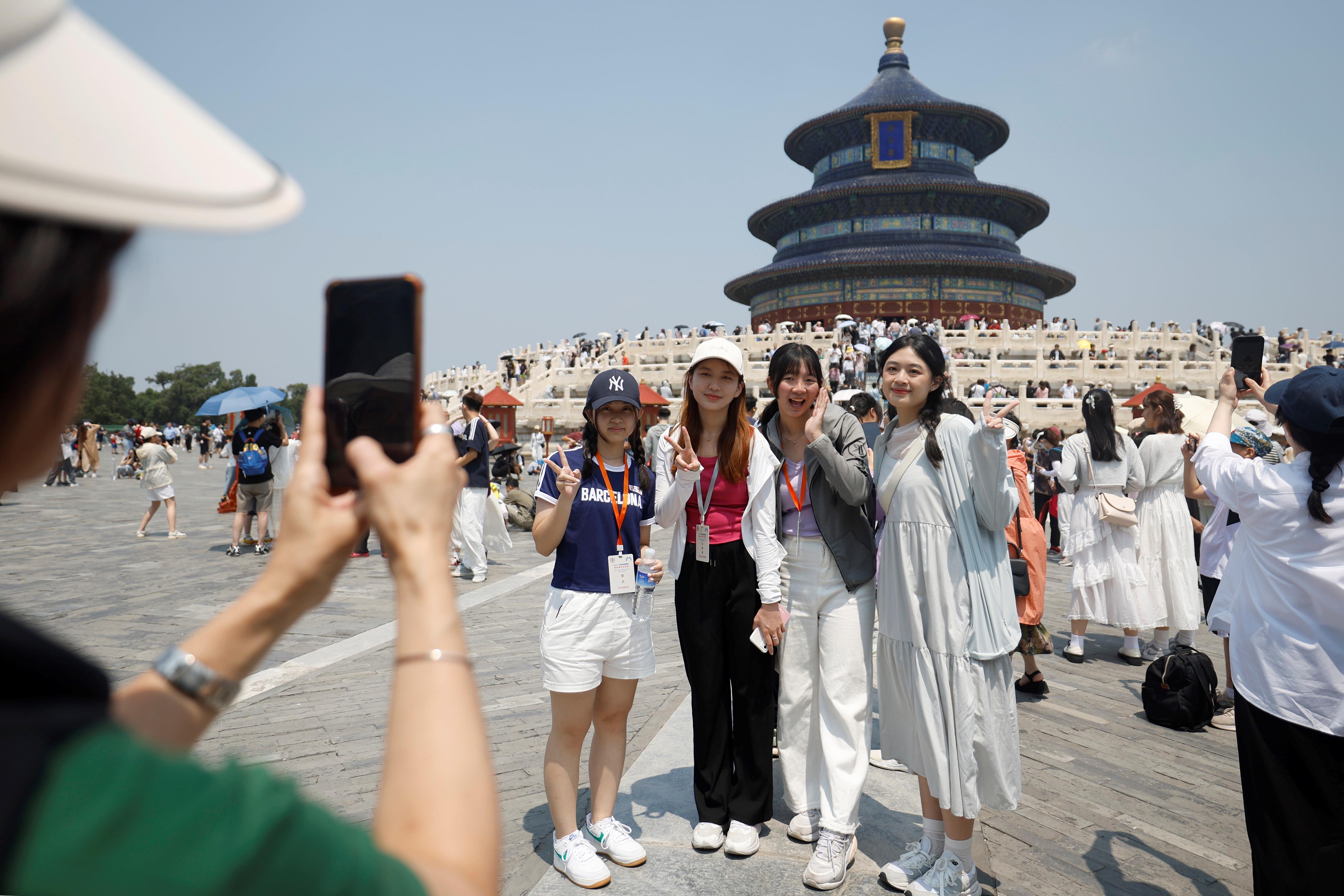 △2024年7月3日,臺(tái)灣青年在天壇公園拍照留念。當(dāng)日,2024“未來(lái)能源領(lǐng)袖”兩岸青年交流營(yíng)的營(yíng)員參觀游覽北京的奧林匹克公園、天壇公園等地。