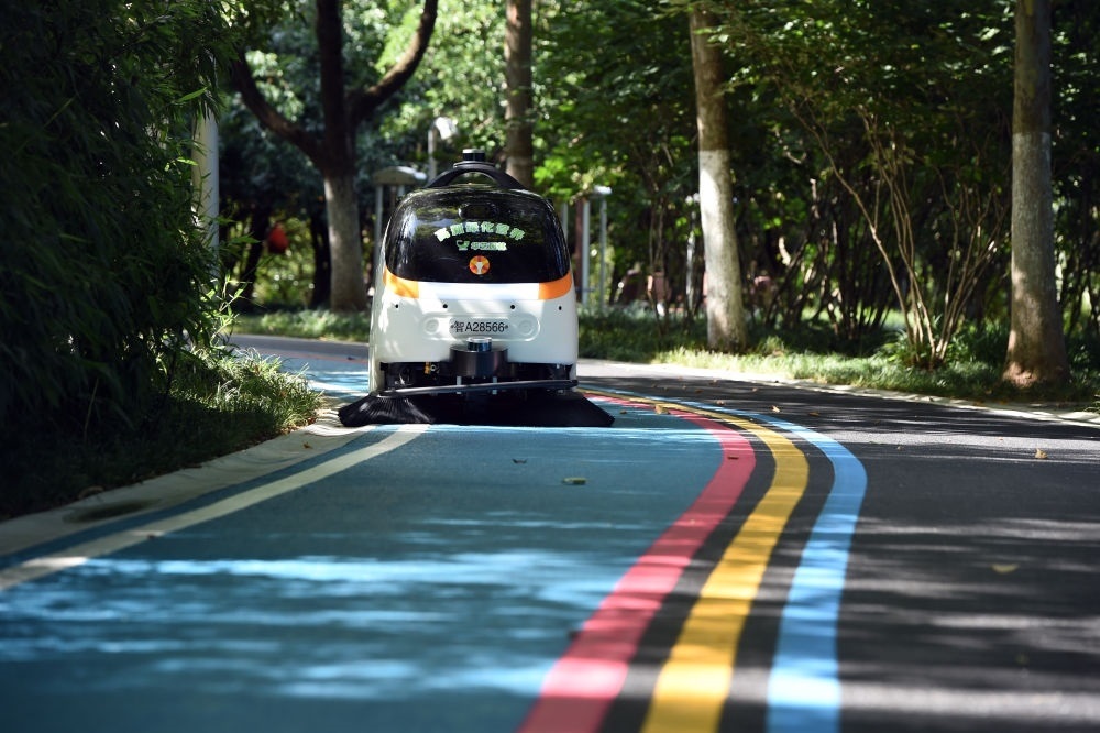 2022年6月24日,智能無人清掃機(jī)器人在安徽合肥一處公園清掃路面。