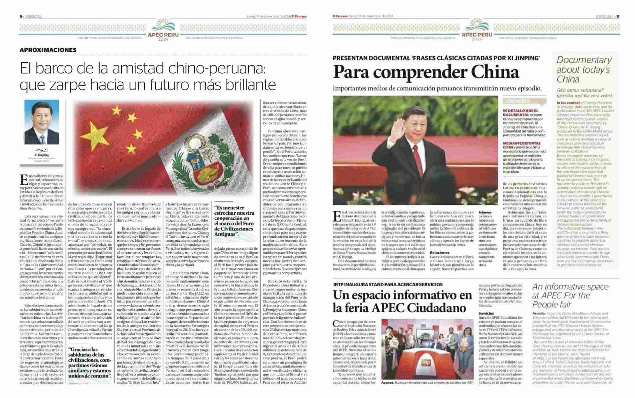 11月14日,秘魯最具影響力的官方報(bào)紙《秘魯人報(bào)》刊發(fā)節(jié)目在秘魯落播的消息。文章指出,《平“語(yǔ)”近人——習(xí)近平喜歡的典故》第三季展現(xiàn)了中華民族開(kāi)放包容、兼收并蓄的文化胸懷,闡釋了習(xí)近平主席提出的推動(dòng)構(gòu)建人類(lèi)命運(yùn)共同體的這一重大理念,是對(duì)“建設(shè)一個(gè)什么樣的世界、怎樣建設(shè)這個(gè)世界”給出的中國(guó)方案。《秘魯人報(bào)》特刊整版刊發(fā)《平“語(yǔ)”近人——習(xí)近平喜歡的典故》第三季(西班牙語(yǔ)版)將在秘魯主流媒體落播特稿?!睹佤斎藞?bào)》官網(wǎng)也同步刊發(fā)了節(jié)目預(yù)告消息和海報(bào)。