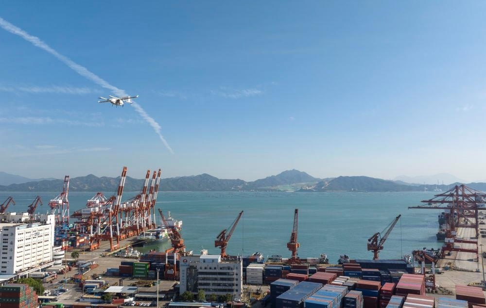 △無人機(jī)搭載快件從珠海飛抵深圳蛇口集裝箱碼頭起降點。
