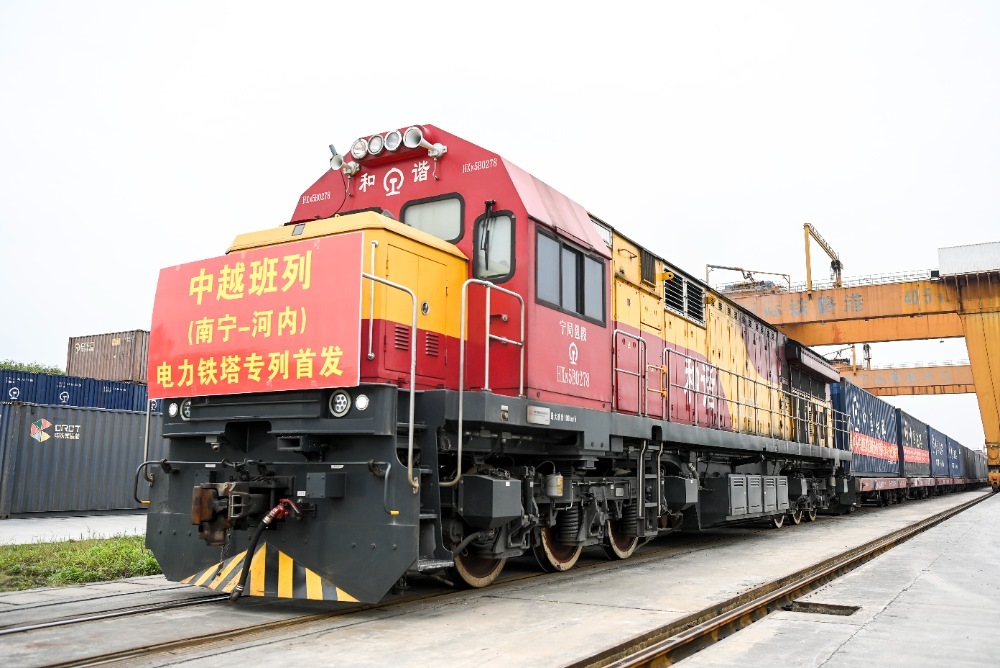 2024年3月8日,在廣西南寧國際鐵路港,電力鐵塔專列準(zhǔn)備發(fā)車。當(dāng)日,一列滿載340噸電力鐵塔的中越班列從南寧國際鐵路港開出,發(fā)往越南河內(nèi)。新華社記者 曹祎銘 攝