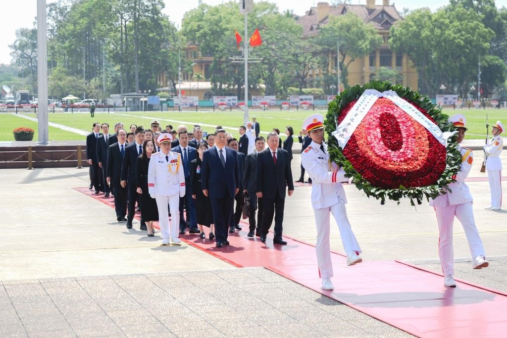15日上午,在蘇林陪同下,習(xí)近平瞻仰胡志明陵并敬獻花圈。