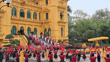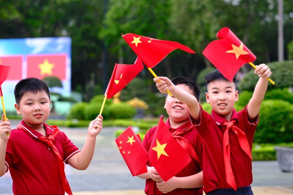 主席府廣場上,五星紅旗同金星紅旗迎風飄揚,200多名越南少年兒童揮舞旗幟,熱烈歡迎習(xí)近平到訪。