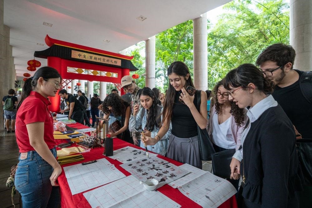 △2025年4月,在巴西里約熱內(nèi)盧天主教大學(xué)舉辦的“國(guó)際中文日”慶?;顒?dòng)上,學(xué)生們體驗(yàn)中文書(shū)法。