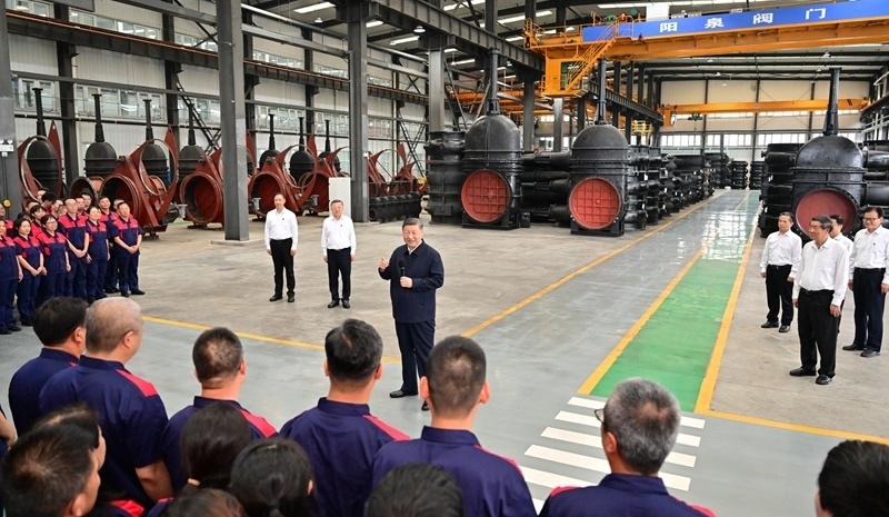 7月7日至8日,中共中央總書記、國家主席、中央軍委主席習(xí)近平在山西考察。這是7日下午,習(xí)近平在陽泉閥門股份有限公司考察時,同企業(yè)員工在一起。新華社記者 燕雁 攝