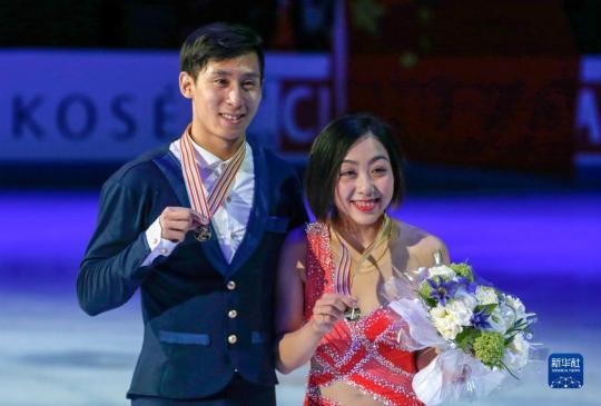 2017年3月30日,隋文靜(右)/韓聰在芬蘭赫爾辛基舉行的2017年花樣滑冰世錦賽雙人滑比賽頒獎儀式上。新華社發(fā)(馬蒂凱寧攝)