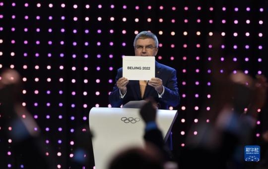 2015年7月31日,國際奧委會主席巴赫在國際奧委會第128次全會上宣布北京攜手張家口獲得2022年冬奧會舉辦權。新華社記者 公磊 攝