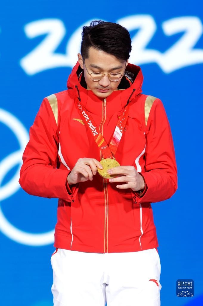 2月8日,亞軍中國隊(duì)選手李文龍?jiān)讵勁祁C發(fā)儀式上。