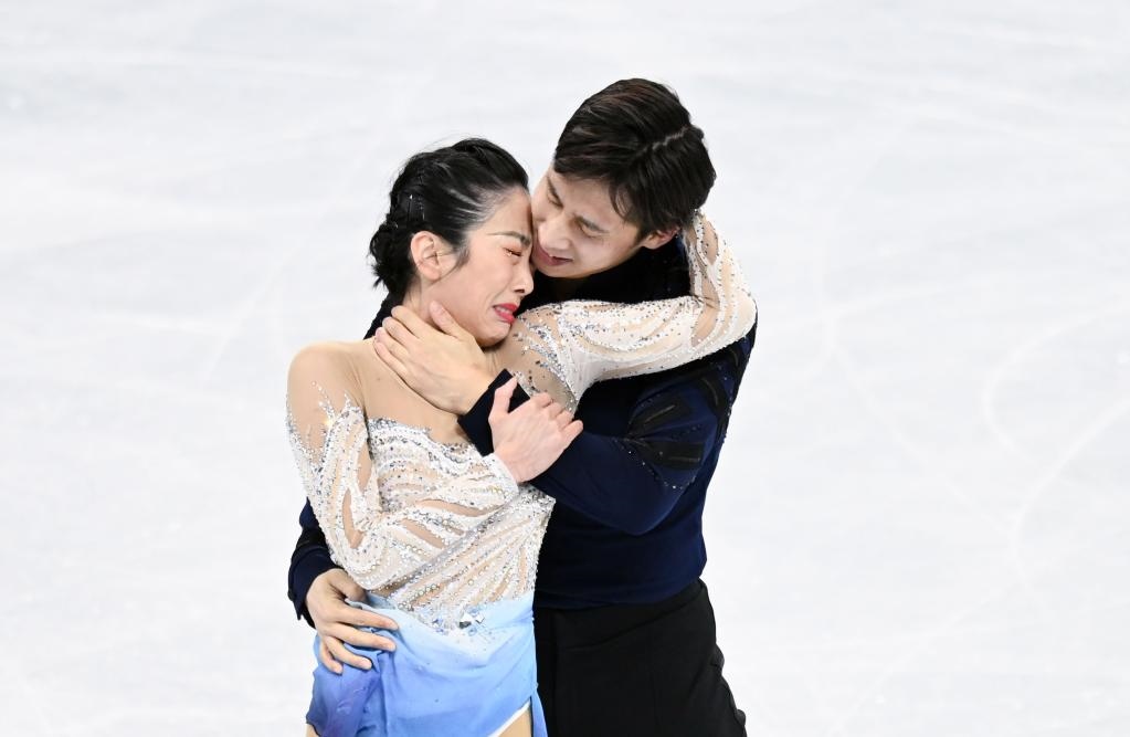 2月19日,中國(guó)選手隋文靜(左)/韓聰在2022年冬奧會(huì)花樣滑冰雙人滑比賽奪冠后。新華社記者李一博攝