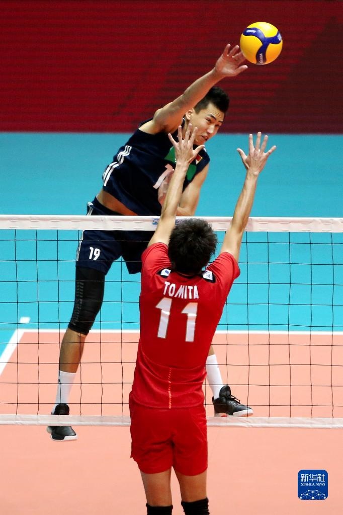 8月14日,中國隊球員張景胤(右一)在比賽中扣球。新華社記者 王騰 攝