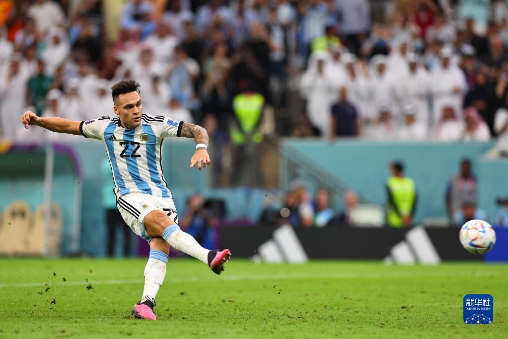 12月9日,阿根廷隊球員勞塔羅·馬丁內(nèi)斯在點球大戰(zhàn)中主罰點球得分。