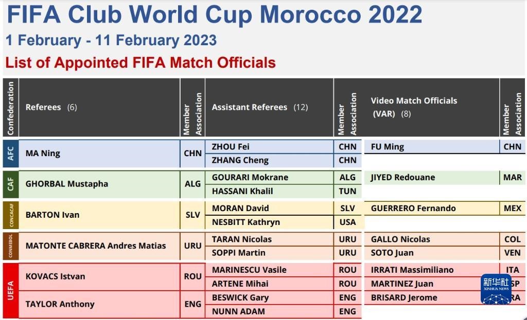 新華社北京1月15日電 國際足聯(lián)15日在官網(wǎng)公布2022摩洛哥世俱杯執(zhí)法裁判員名單,國際級(jí)裁判員馬寧、傅明和國際級(jí)助理裁判員周飛、張鋮入選。這將是中國裁判員首次執(zhí)法該項(xiàng)國際足聯(lián)頂級(jí)賽事。