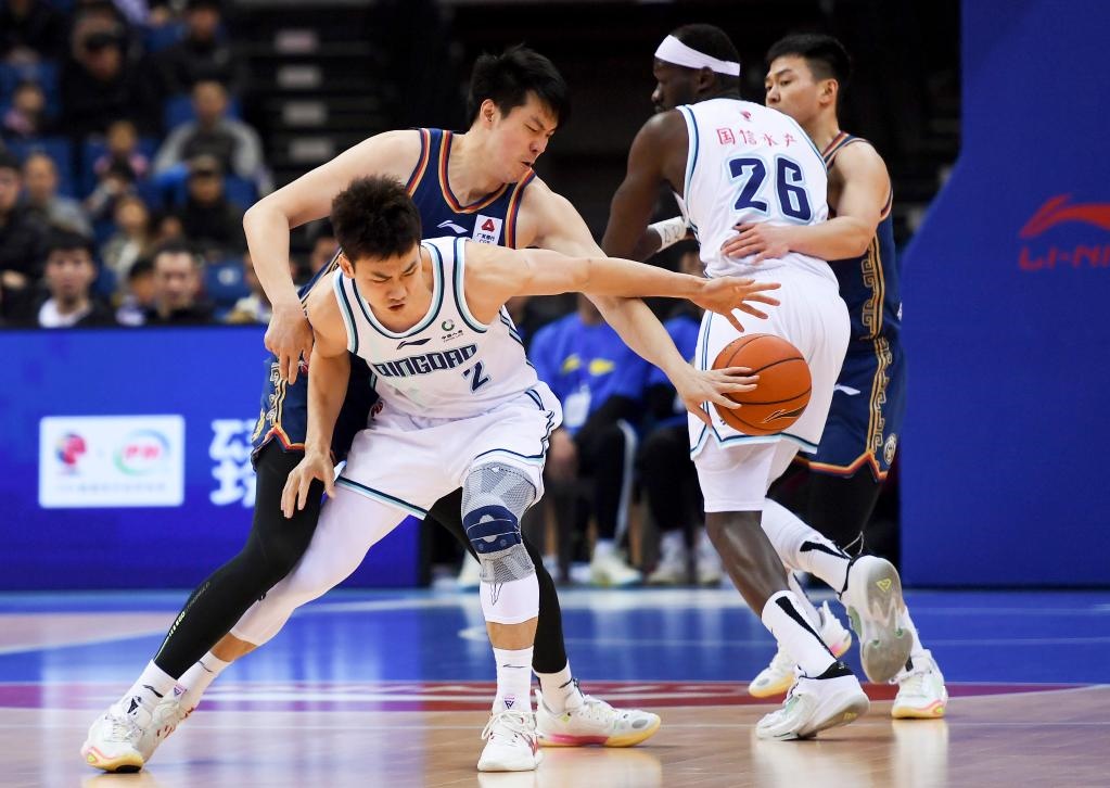 3月13日,青島隊球員王睿澤(左前)與南京同曦隊球員董瀚麟(左后)拼搶。新華社記者李紫恒攝