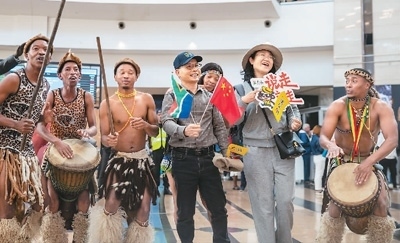中國旅游團抵達(dá)南非,南非旅游局在機場舉行歡迎儀式。 新華社記者 張譽東攝