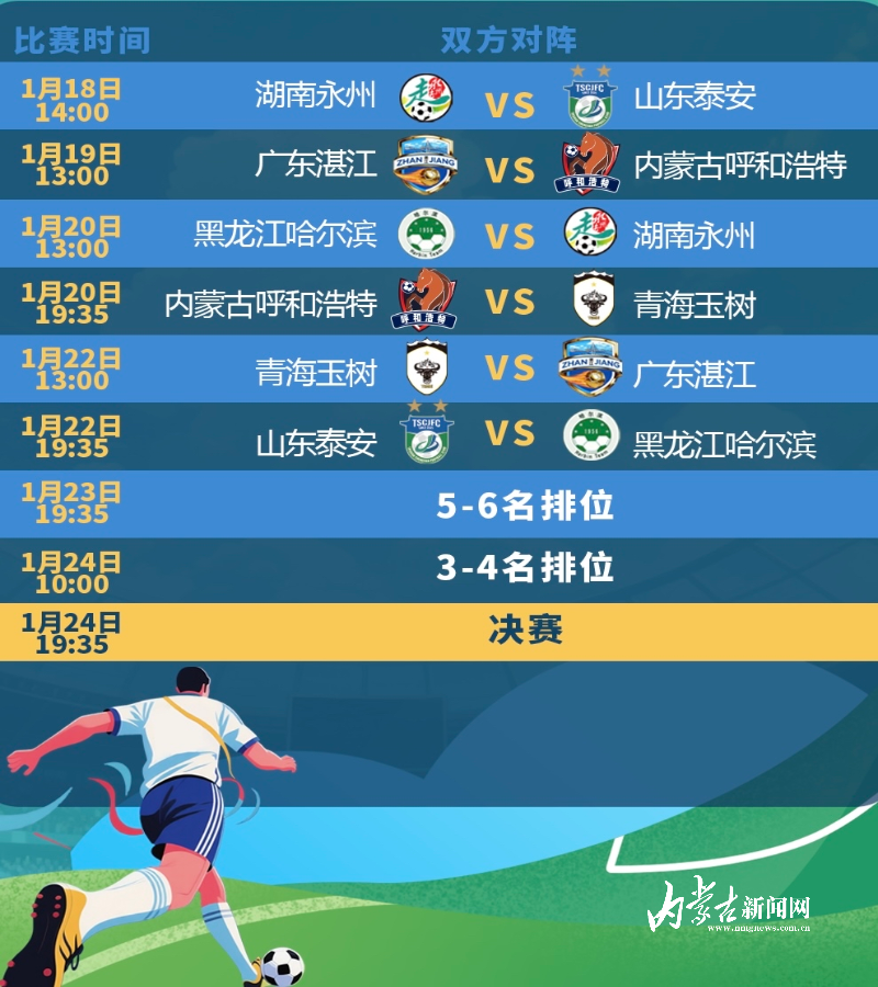 群眾足球風(fēng)云再起,一場匯聚南北、融合競技與文化的群眾足球盛宴即將激情上演。1月18日至1月24日,CMG群眾足球邀請賽將在湖南省永州市拉開帷幕。1月11日晚,抽簽結(jié)果正式揭曉,呼和浩特隊將于1月19日首戰(zhàn)粵超冠軍廣東湛江隊。球隊將于1月16日啟程,在永州進行合練。