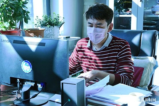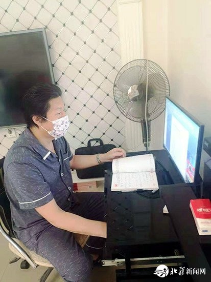 喀喇沁旗烏蘭牧騎隊長吳國輝在家中創(chuàng)作快板作品《為逆行者點贊》。受訪者供圖