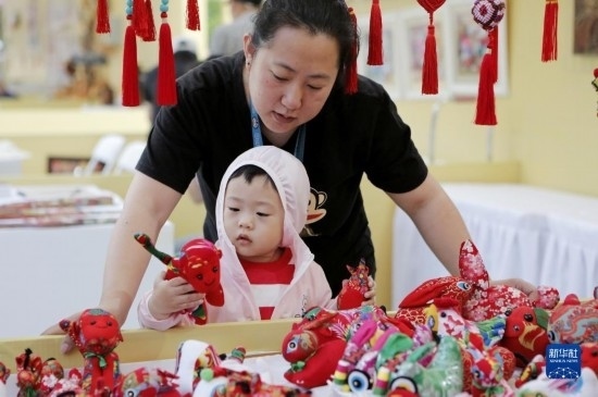 6月10日,在哈爾濱市索菲亞廣場(chǎng)非遺工坊展,市民在了解傳統(tǒng)手工布藝展品。